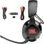 Levántese para tomar un refrigerio sin siquiera quitarse los auriculares. JBL Quantum 600 es un auricular inalámbrico de 2,4 GHz sin pérdidas para juegos completo con una duración de batería de 14 horas (máx.).