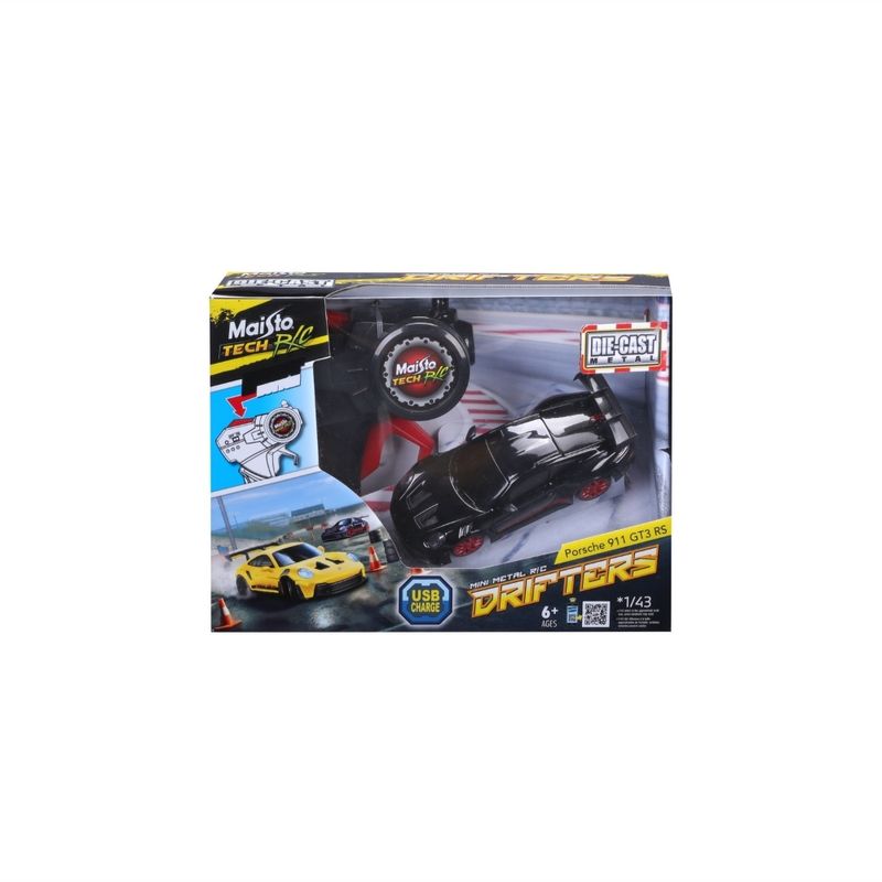 Fabricado por Maisto, este Porsche 911 GT3 RS pertenece a la serie Mini Metal R/C Drifters y viene en escala 1:43. Mide aproximadamente 10 cm de largo y está hecho con carrocería metálica y detalles plásticos. El auto cuenta con sistema de control remoto, batería interna recargable mediante cable USB (incluido), ideal para sesiones prolongadas de juego sin necesidad de pilas. Su tamaño lo hace perfecto para interiores y pistas reducidas.