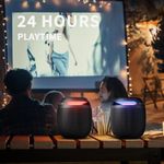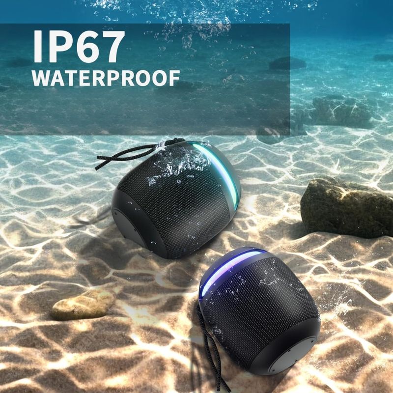 Altavoz inalámbrico con certificación IP67, batería recargable, diseño compacto y luces de fiesta. Perfecto para exteriores, playa o casa con sonido claro y envolvente.
