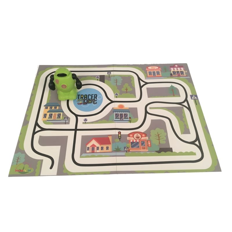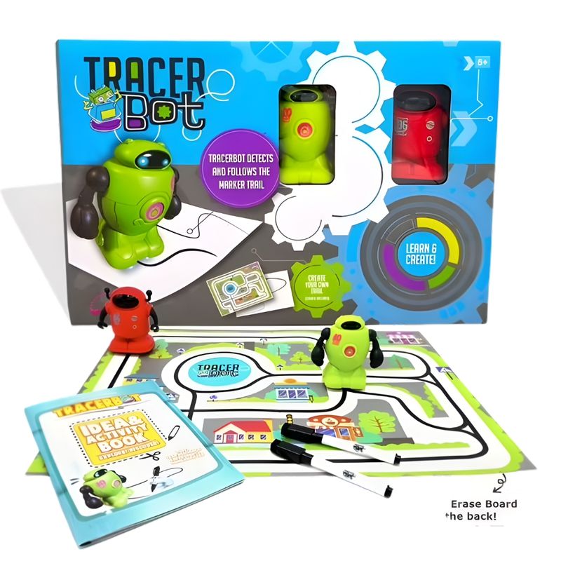 El set incluye dos robots Tracerbot en diferentes colores, cada uno con sensores ópticos que detectan y siguen líneas negras dibujadas en papel. Funciona con un lápiz especial incluido (o cualquier marcador negro de punta gruesa). No necesita WiFi ni app. Cada robot funciona con baterías LR44 (incluidas) y está hecho con materiales seguros para niños. Es liviano, compacto (cada robot mide aprox. 5 cm x 4 cm) y fácil de transportar. Ideal para niños mayores de 5 años y recomendado como juguete educativo STEM.