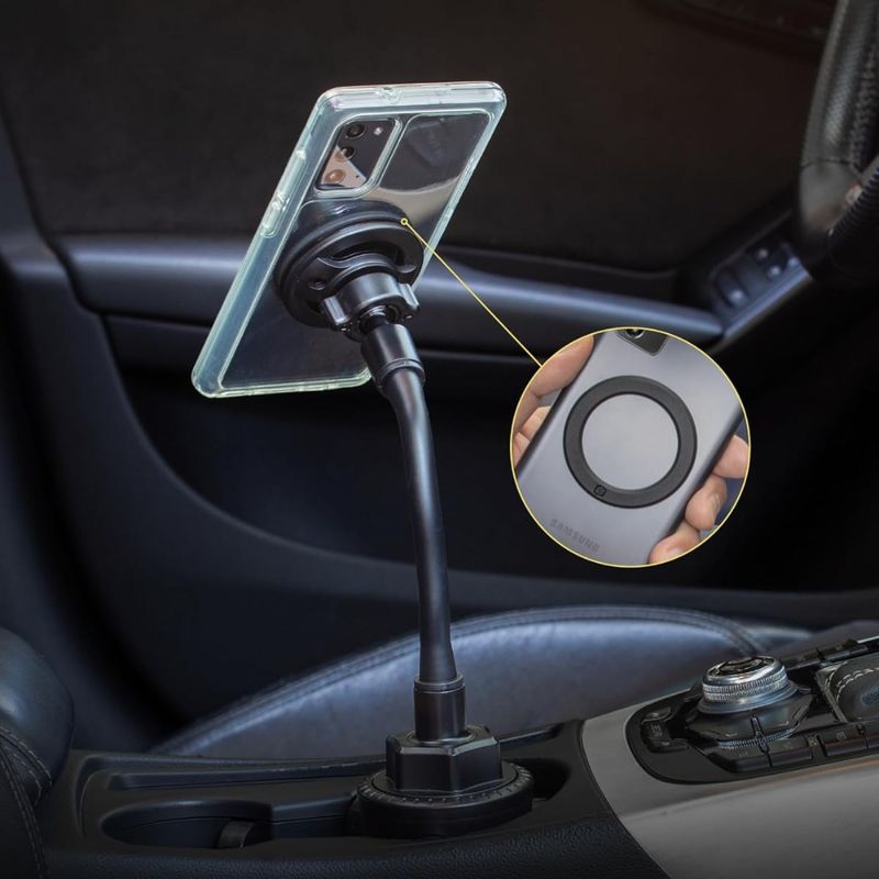 Sujeta tu iPhone o Android con firmeza en el portavasos del auto. Ángulo ajustable, imán fuerte y compatible con MagSafe.