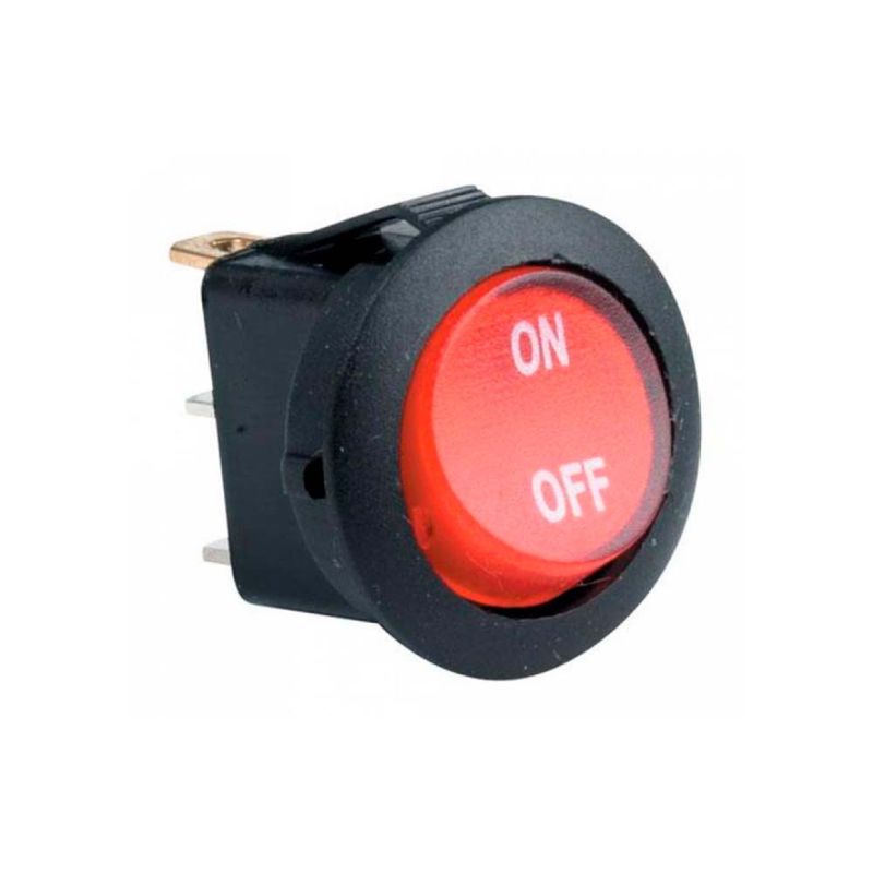 Interruptor (Switch) de balancín, redondo, con foco piloto, de 10/6 A, 125/250 V CA, 1 polo, 1 tiro y 2 posiciones (ON-OFF). Fabricado en plástico color negro.