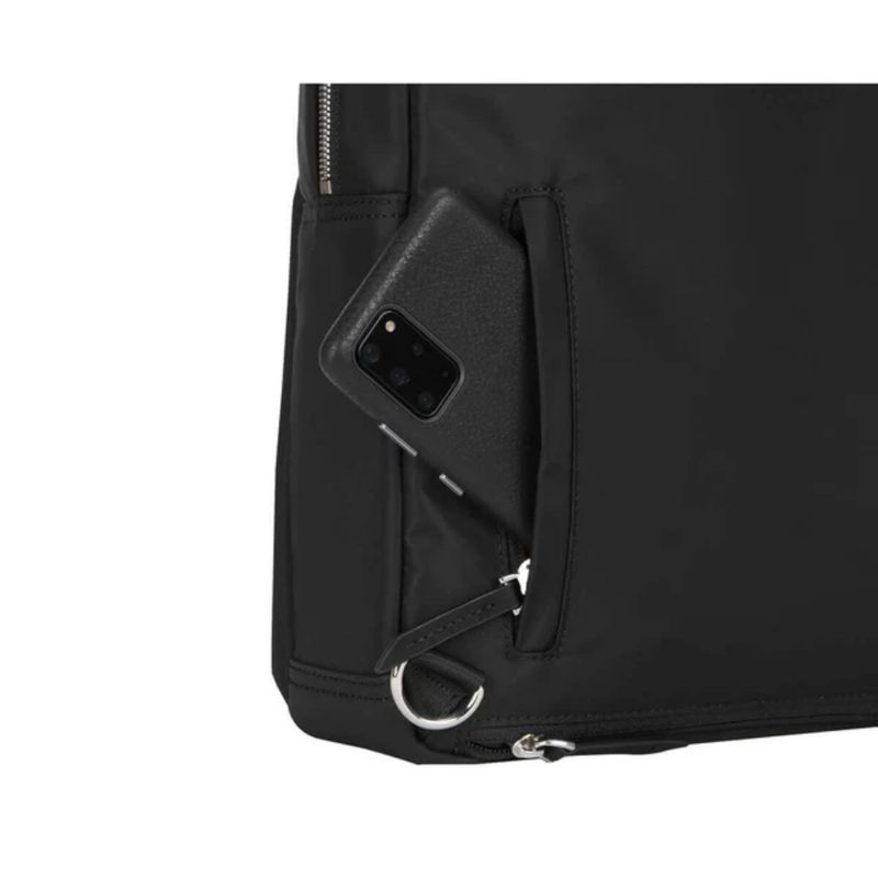 Fabricada con nylon de alta densidad repelente al agua, pesa 0.56 kg y tiene capacidad de 12 litros. Incluye un compartimento principal con cradle para laptop, bolsillo frontal con cremallera, y un bolsillo trasero oculto. Las correas se pueden ocultar para convertirla en tote, y se puede acoplar a equipaje rodante.