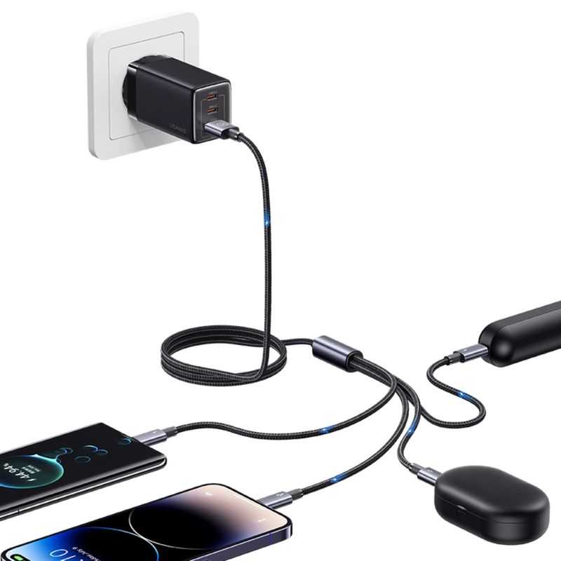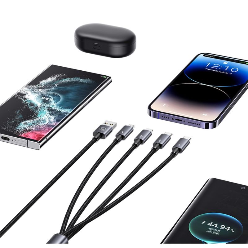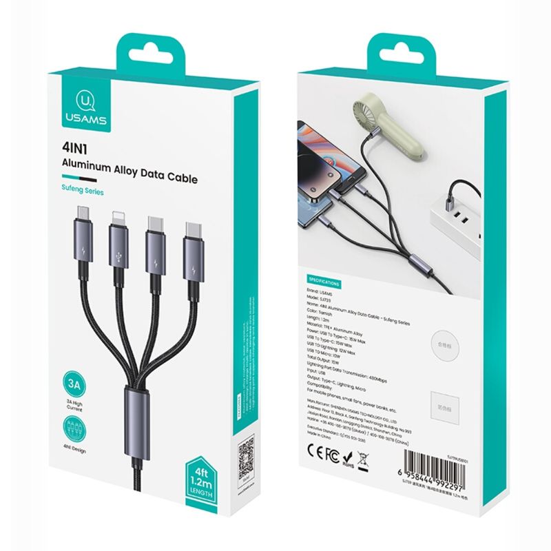 Con el cable 4 en 1 de USAMS puedes olvidarte del caos de tener varios cables para cada dispositivo. Gracias a sus múltiples conectores (USB-C x2, Lightning y MicroUSB), puedes cargar teléfonos Android, iPhone, audífonos, tablets o cualquier otro dispositivo compatible desde una sola fuente de energía. Tiene una longitud de 1.2 metros, perfecta para usar en casa, el auto o en la oficina. Soporta carga rápida hasta 15W y está fabricado con materiales resistentes que aseguran una larga vida útil.
