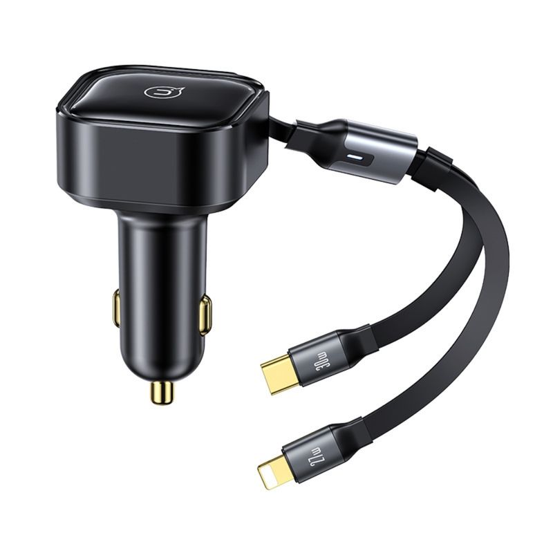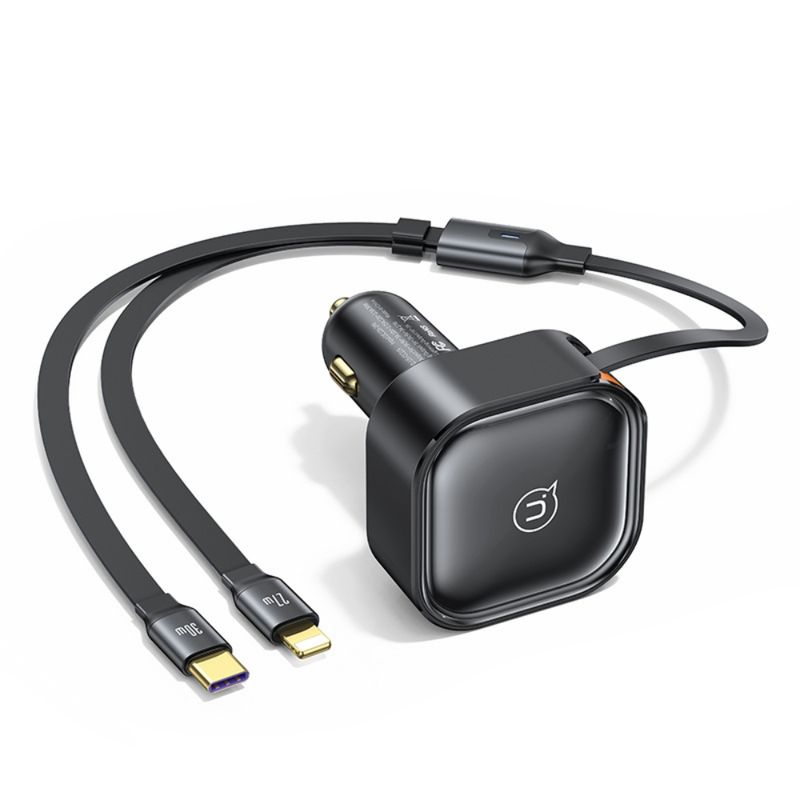 Cargador de auto compacto con doble puerto y cables retráctiles, perfecto para cargar tu iPhone y otros dispositivos simultáneamente.