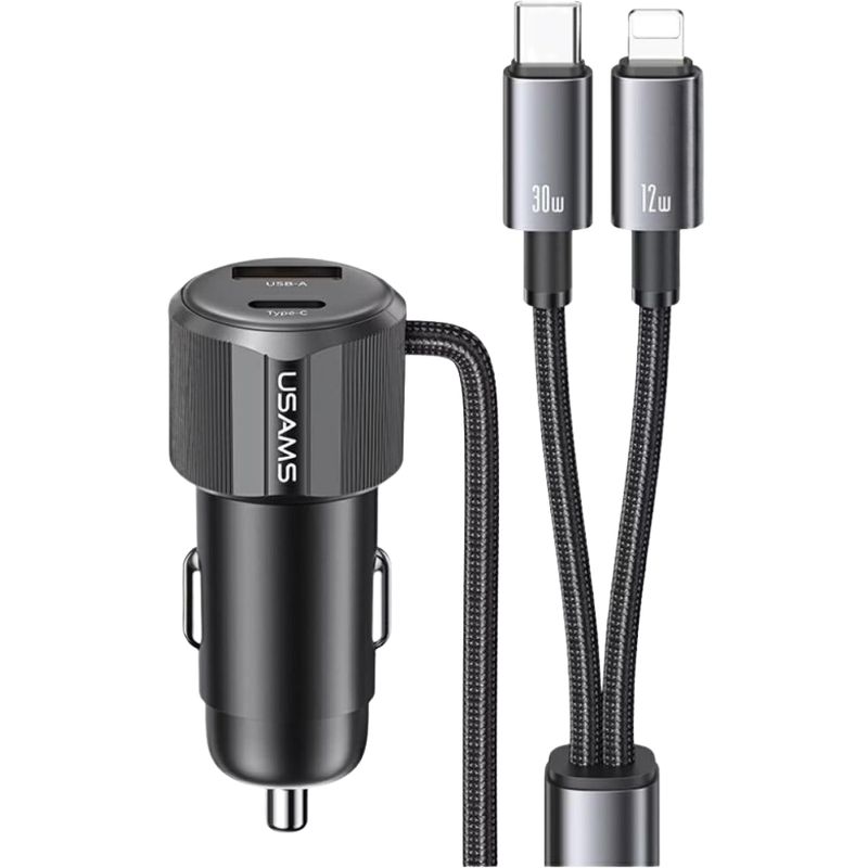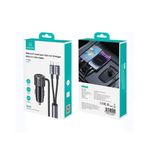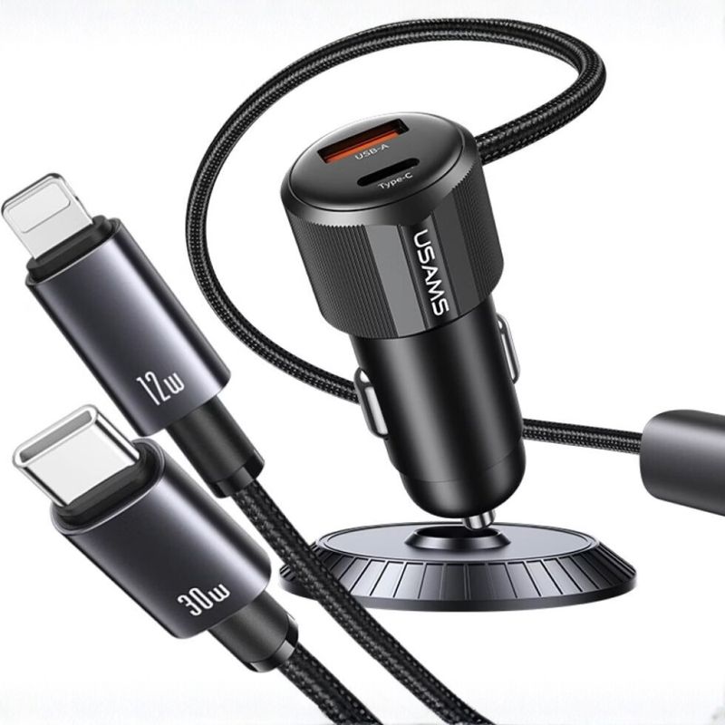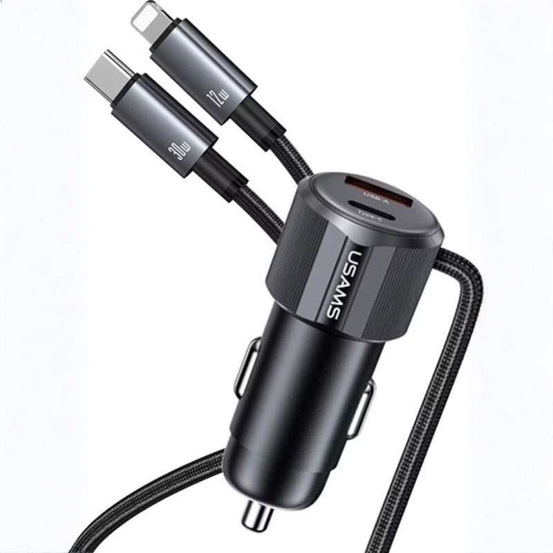 Este cargador rápido para auto de la serie YT de USAMS cuenta con un puerto USB-C con salida de hasta 36W y un puerto USB-A de hasta 30W, sumando una potencia total de 66W. Gracias a su sistema de detección inteligente, ajusta el voltaje según el dispositivo conectado, garantizando una carga segura y eficiente. El cable incluido es 2 en 1, con conectores USB-C y Lightning, lo que lo hace ideal para compartir entre usuarios con diferentes dispositivos. Su cuerpo compacto, duradero y con acabado negro metálico encaja perfectamente en la toma de encendedor del auto.